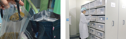 各工場から集まってくる粒は定温倉庫で一定温度で保管し、品実の維持に努めています。