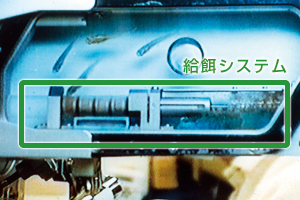 エサは4つの小区画に分かれて給餌システムに収められています。エサは水に触れていないので、劣化したり水を汚す事はありません。ネジを回転させるとエサが給餌口に進みます。給餌口で水に触れたエサは膨らんでメダカが食べられるようになります。この時、他の区画のエサは水に触れないので水質悪化につながりません。このシステムならエサの食べ残しを飼育槽に残さずに、メダカが必要とする量のエサを与える事が可能になります。