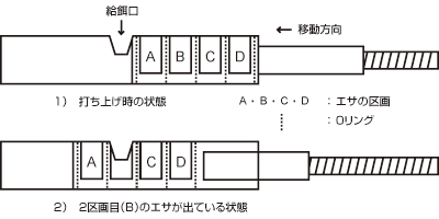 B.宇宙から帰還後のシリンダーの状態。右端の区画が最後に与えられたえさ。エサは水を吸うと膨潤し、給餌口(開口部)から盛り上がり、メダカはこれをつついて食べる。どの区画のエサも、給餌口からメダカの口先が届く範囲までは、ほぼ食べつくされている。
